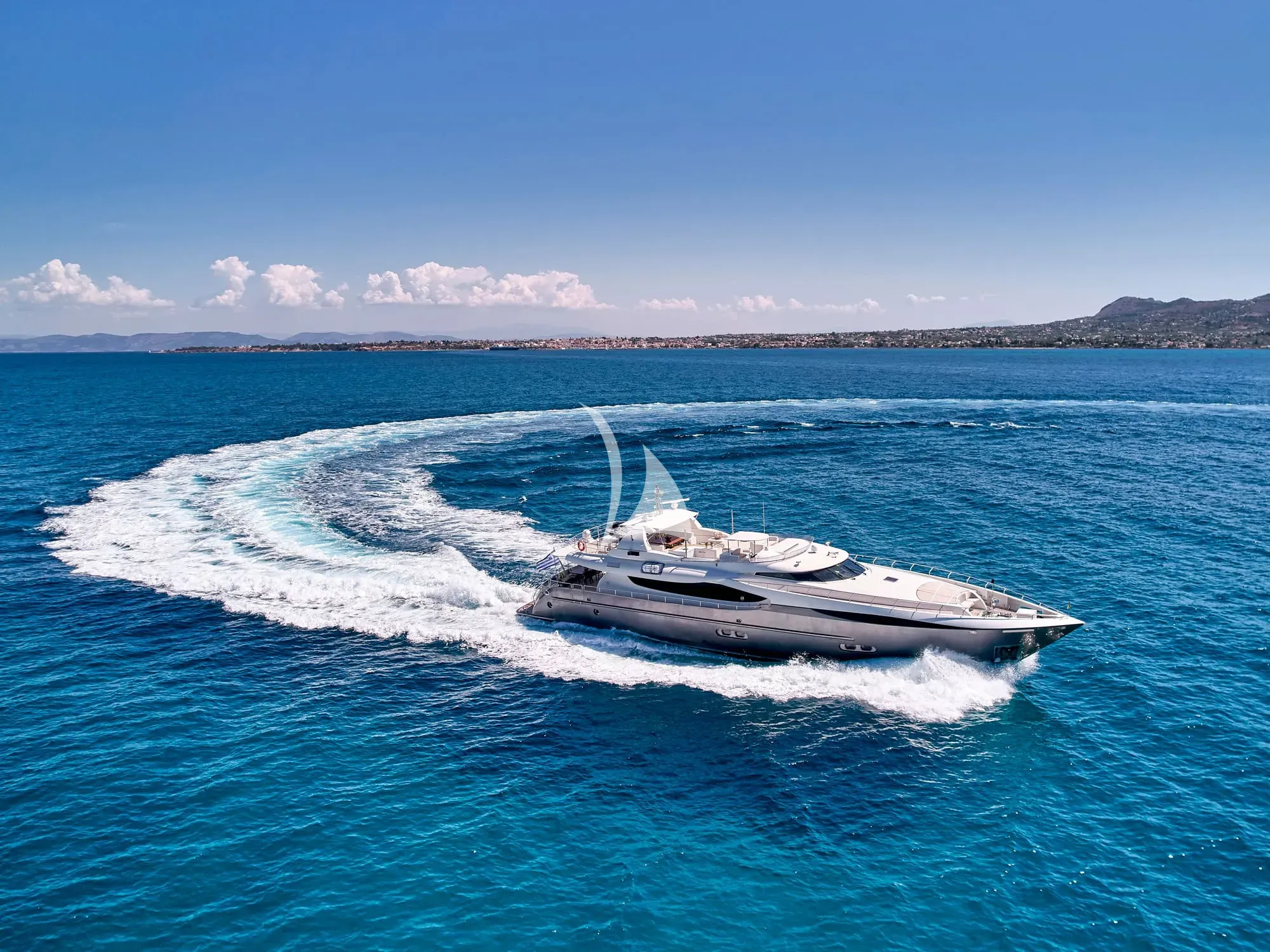 The outdoor realm elevates the charter experience. An expansive flybridge becomes the natural gathering point as SANJANA glides past the Athenian coastline and into the Aegean. Mornings on the foredeck deliver unobstructed sea views; evenings settle into relaxed drinks and conversation with the islands as backdrop. The tender extends reach to quieter bays and hidden anchorages across the Cyclades, enabling both water sports and solitary exploration.