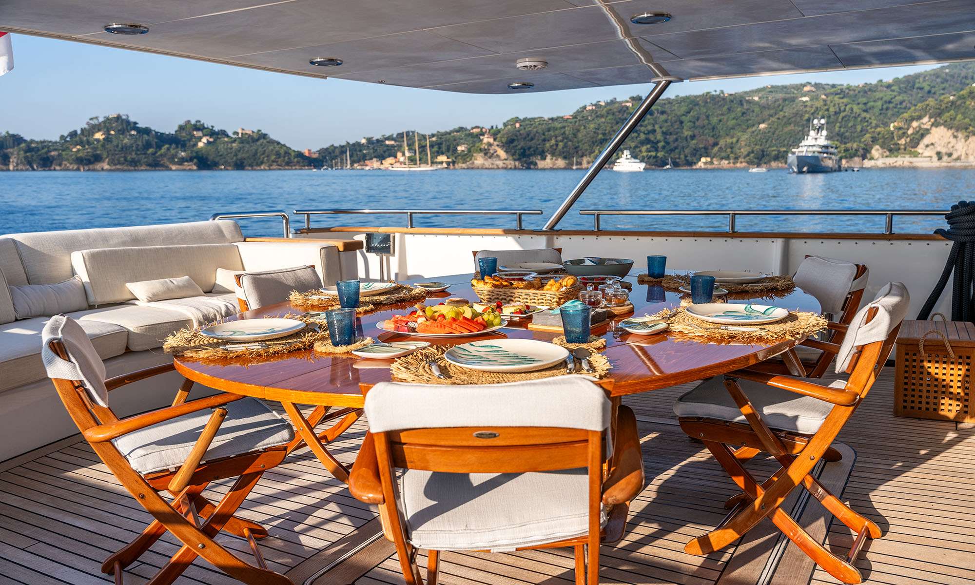 Your dedicated crew of 8, led by Captain Cesar and Chef Bruno, tailors each day to your preferences. Mornings begin with breakfast on the sun-drenched foredeck, whilst the flybridge provides an elegant setting for sunset aperitifs. The aft deck transforms into an alfresco dining venue, and the naturally lit saloon and dining areas offer respite from the heat. Each cabin features private ensuite facilities, ensuring restorative rest after full days of exploration.