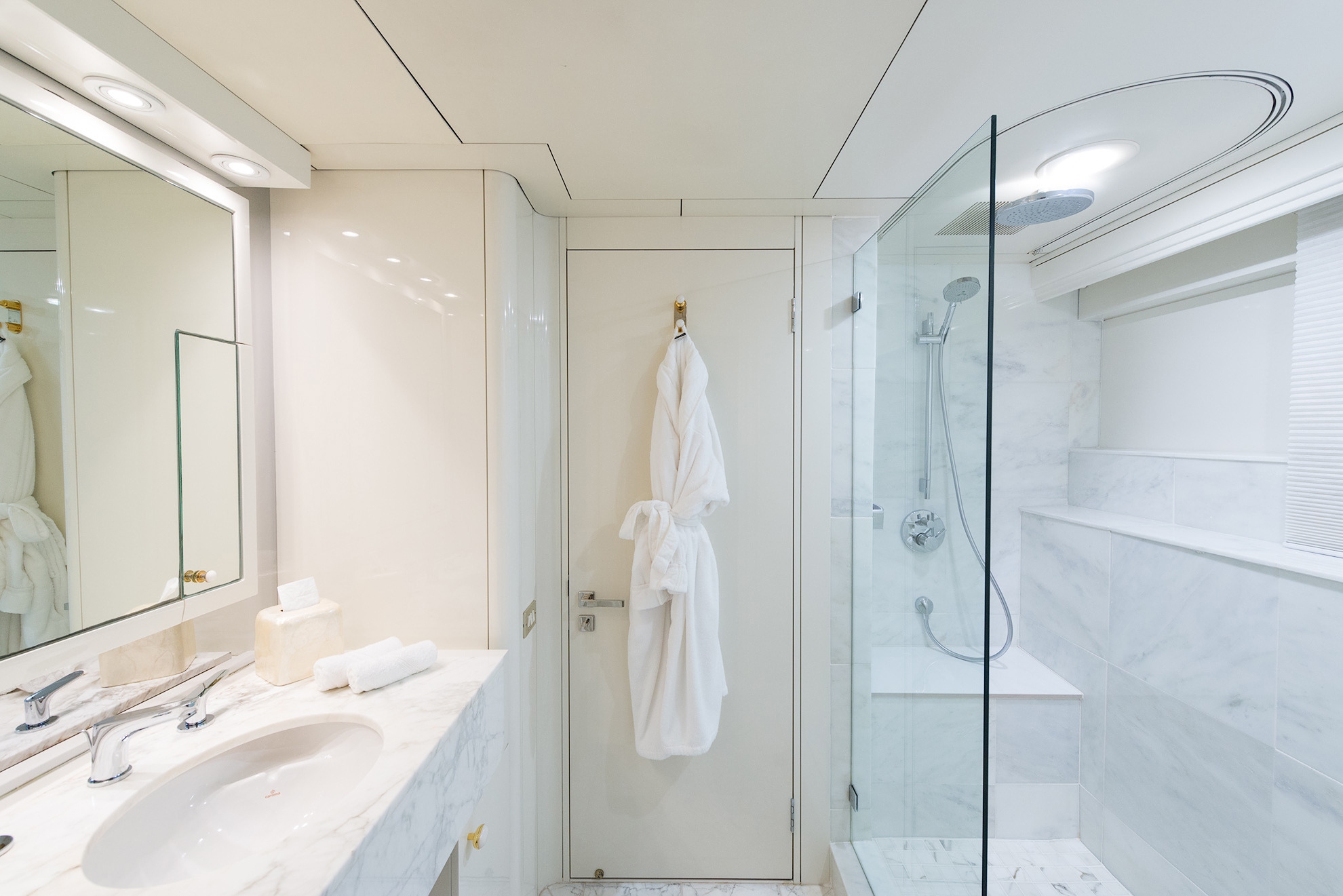 The Master Suite commands the yacht with a king bed positioned centrally, its neutral palette amplifying the sense of space. Four additional cabins accommodate family members or close friends, each configured with either doubles or convertible bunks. Your crew of four anticipates requirements with the discretion expected aboard vessels of this calibre.
