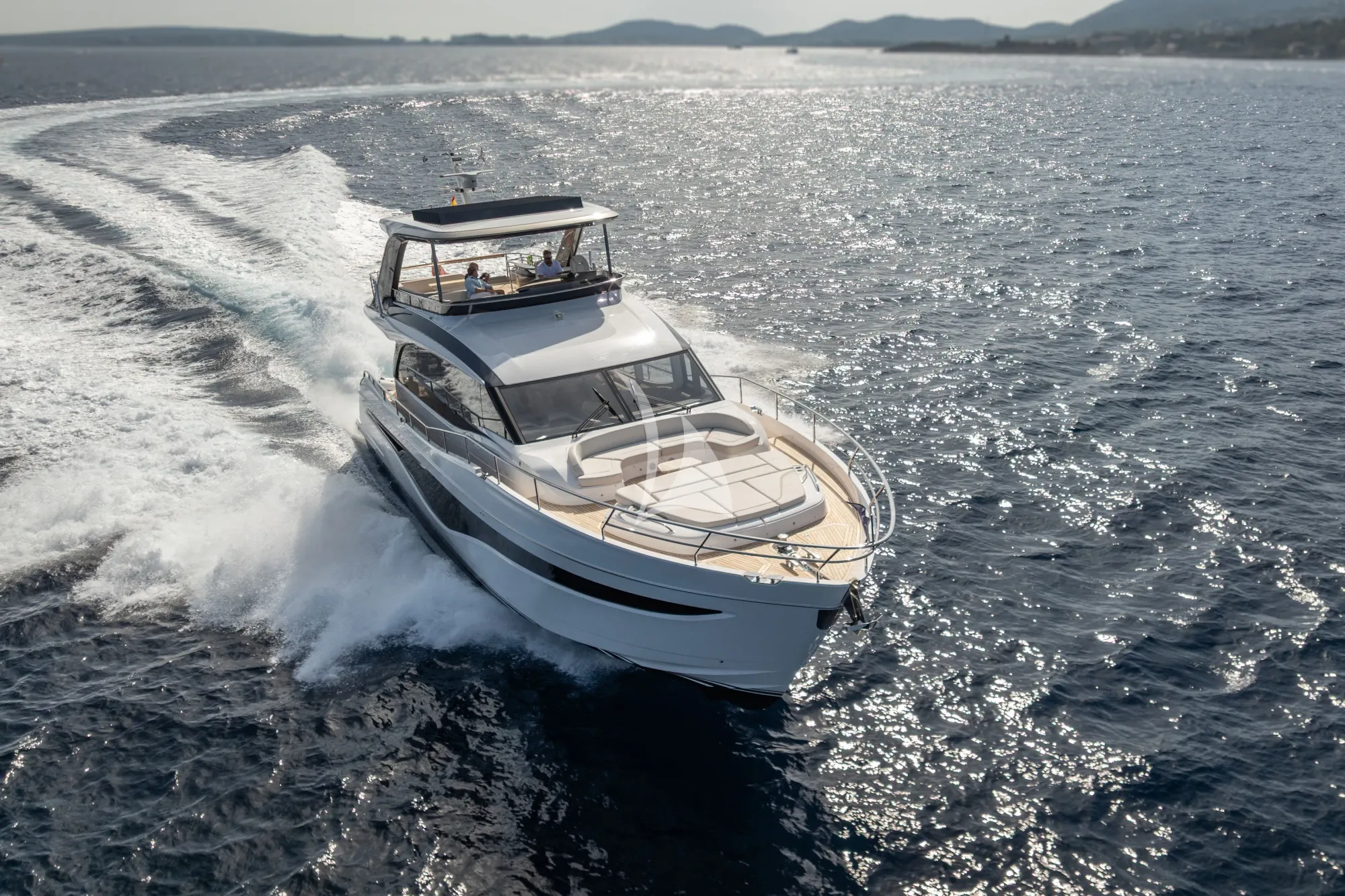 - •Dual-deck entertaining with foredeck sunpads, aft dining, and flybridge lounge
