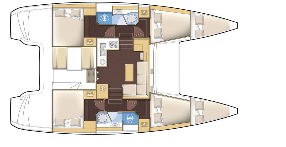 Four cabins accommodate up to twelve guests across dual hulls, each featuring natural light through fixed hull windows and cross-ventilation via hatches and portholes. The expansive deck plan provides generous socialising and dining zones ideal for Caribbean conditions, whilst the catamaran's shallow draft allows access to anchorages beyond the reach of monohulls.