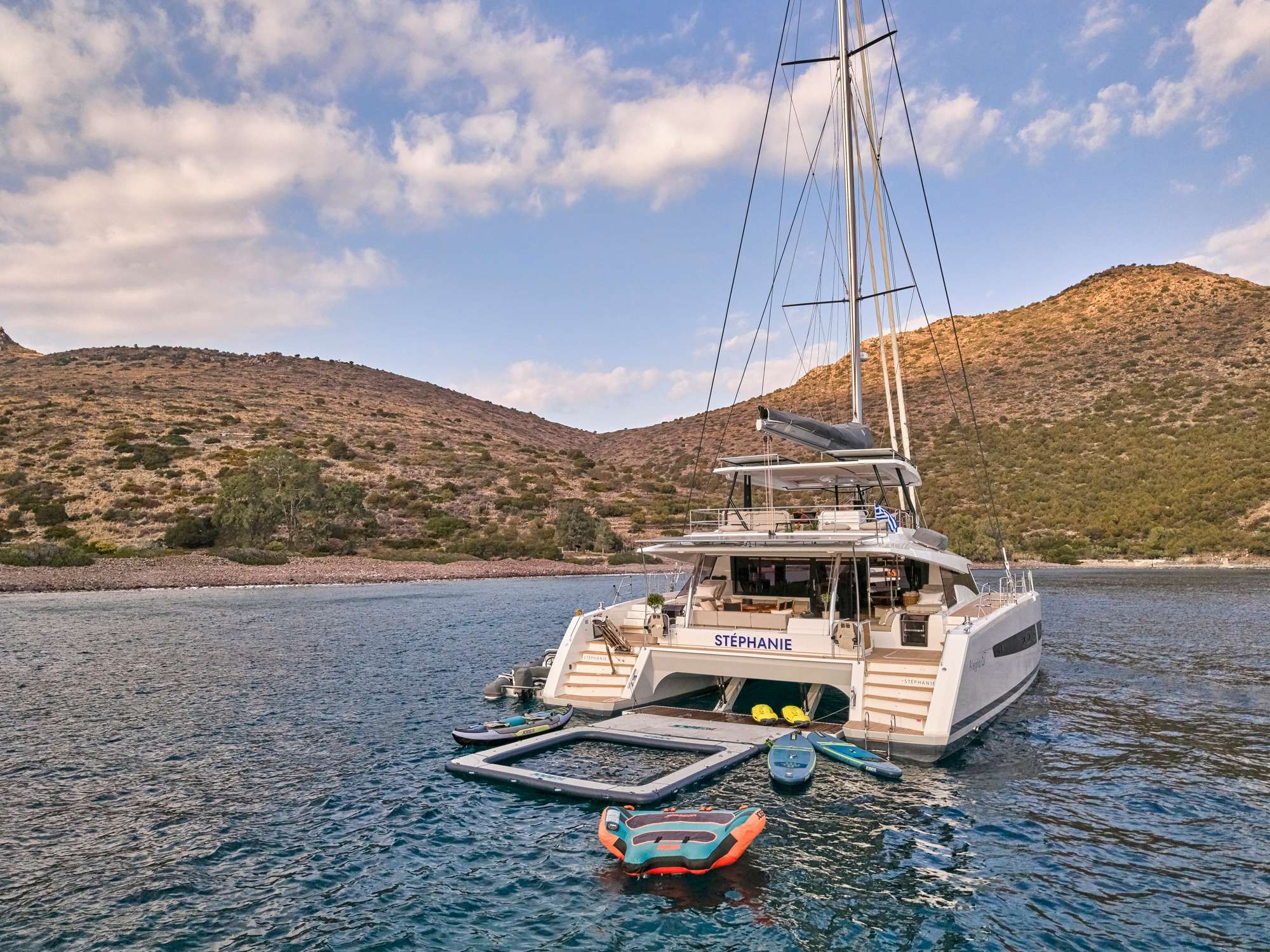 STEPHANIE is a Fountaine Pajot Alegria 67 purpose-built for the Aegean's unhurried rhythm. With four double cabins hosting up to eight guests, she delivers the rare combination of social space and personal retreat, where the saloon and flybridge become natural gathering points without feeling crowded. Every detail reflects intelligent design: the wide beam encourages movement between deck levels, the aft alfresco dining area frames sunset over Mykonos, and the twin foredeck trampolines invite languid mornings before the day takes shape.