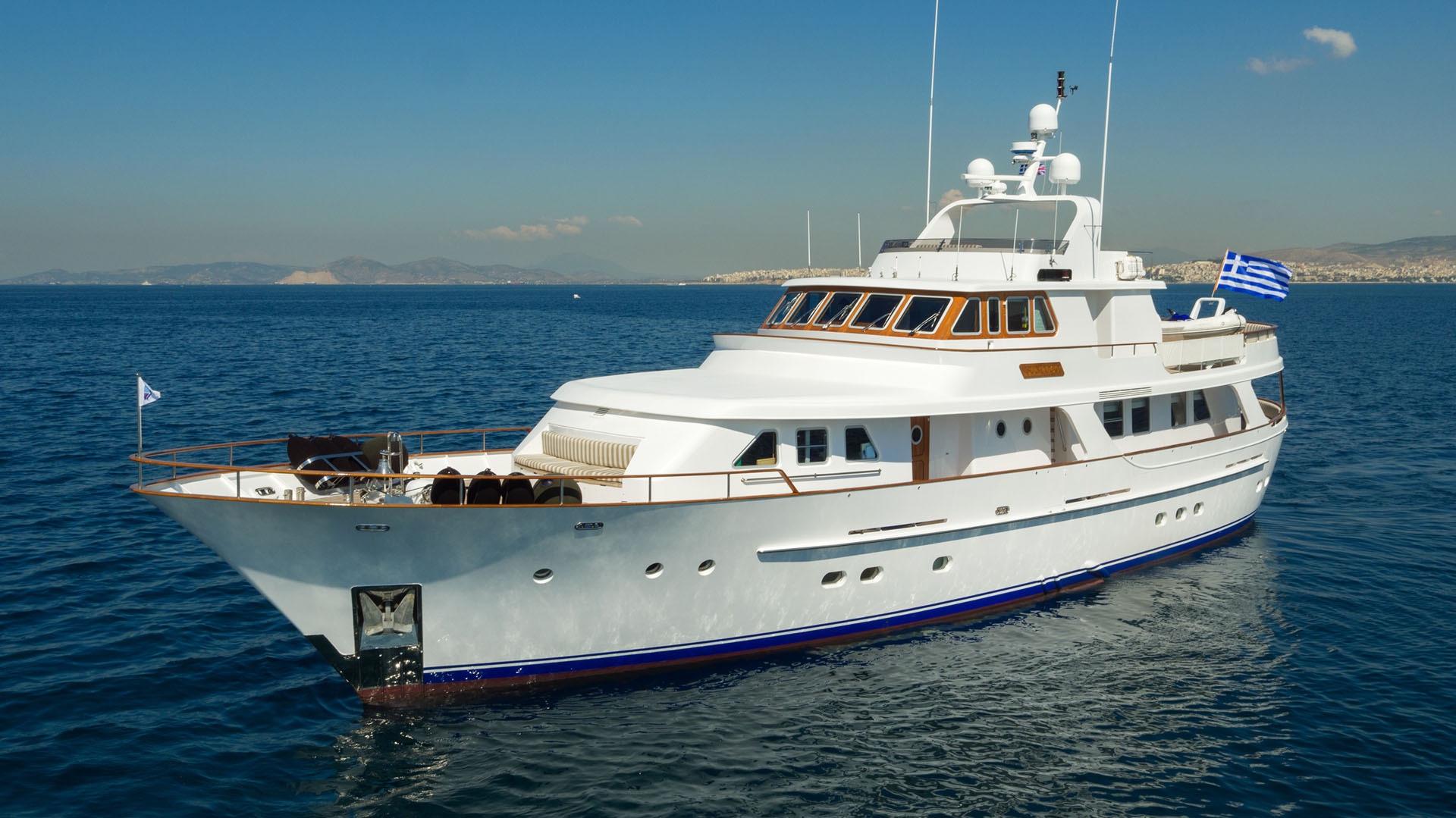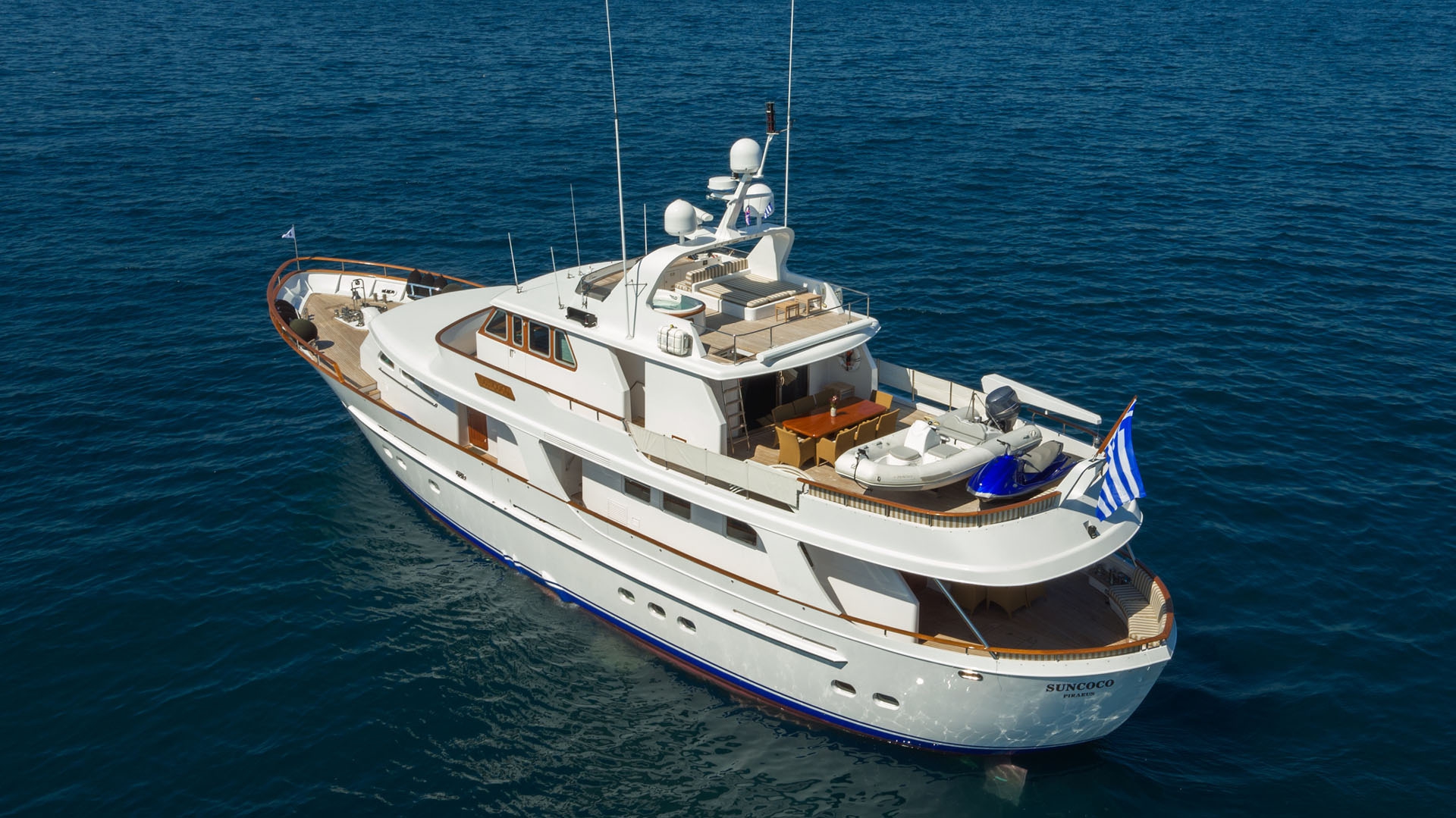 SUNCOCO is a Lowland 103 motor yacht built to endure and designed to indulge. Her substantial beam creates a naturally stable platform for cruising the Greek islands, while a dedicated crew attends to all logistics. Four generously appointed cabins accommodate families and groups seeking private exploration of the Cyclades, Dodecanese, and Ionian waters.