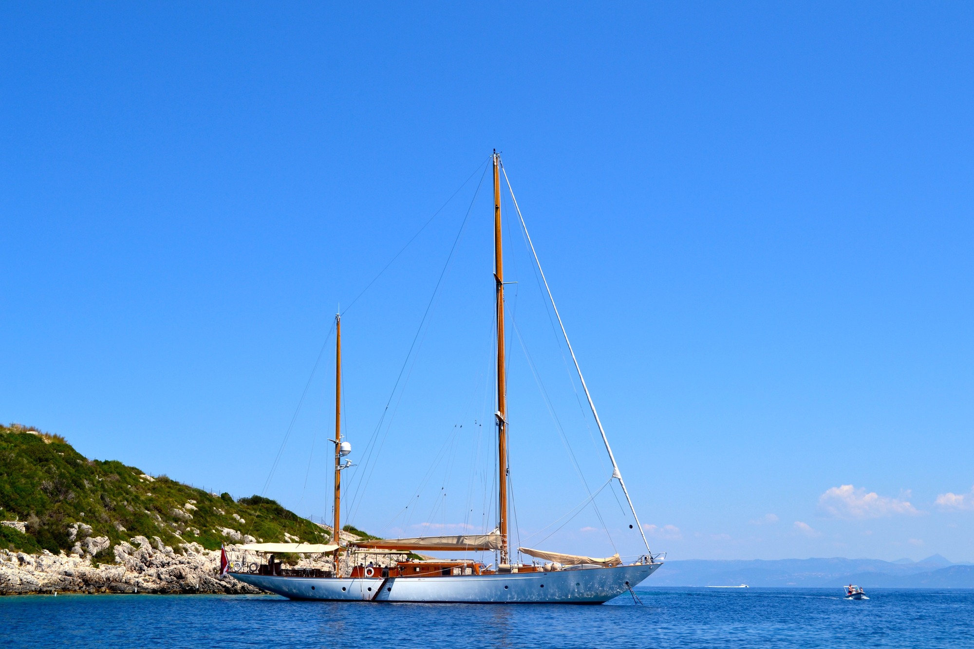 The main saloon showcases expansive windows that flood the wood-lined spaces with daylight, whilst cabin suites follow the same cohesive aesthetic with queen and double berths dressed in bright, complementary fabrics. An al fresco dining table on deck positions guests directly above the Mediterranean, ideal for chef-prepared meals and evening aperitifs. Modern conveniences—entertainment systems and Wi-Fi—operate quietly in the background, never intruding on the vessel's classical character.