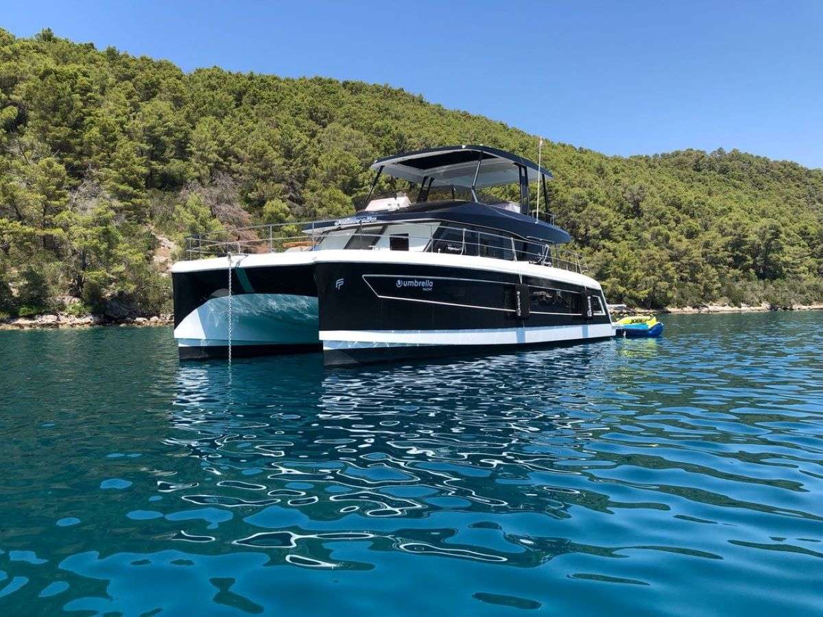 UMBRELLA VICTORIA is a Fountaine Pajot 44 catamaran built in 2018, distinctive for her dark hull that sets her apart from the standard fleet. The vessel combines modern and contemporary interiors with the stability and space inherent to catamaran design, making her equally suitable for first-time charterers and experienced sailors seeking relaxed, sociable cruising.